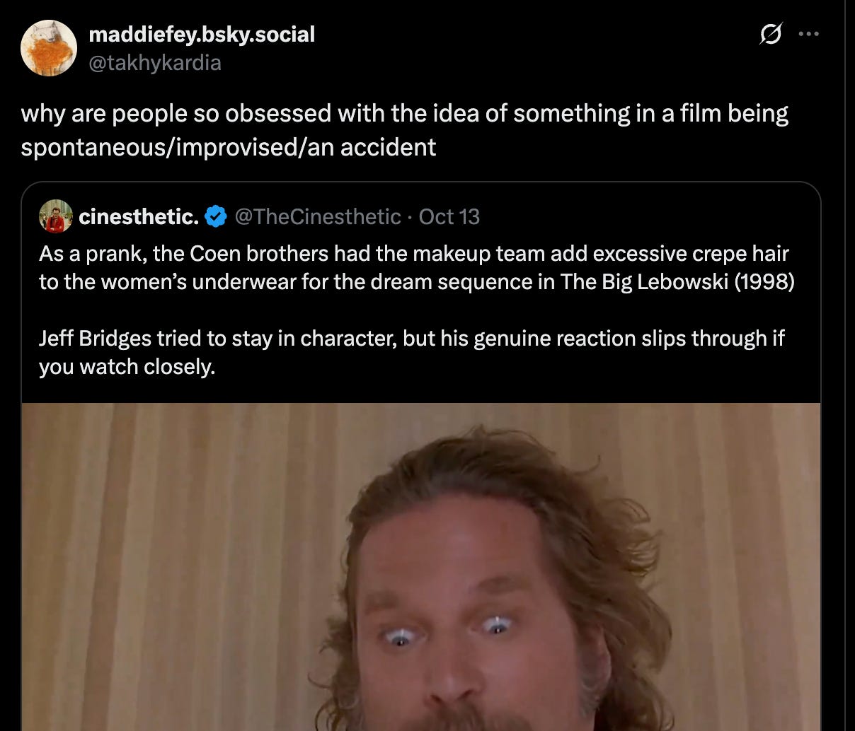 But I’d like to push back on this idea. I think most instances of “improvisation moments” are grossly overblown, and they ignore the real nature of how a film comes to life.